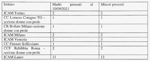 Il numero più alto di presenze si registra all’ICAM di Lauro, in Irpinia, che ospita 11 madri e 13 bimbi (numero che, per un refuso, è stato riportato ieri in una nota).