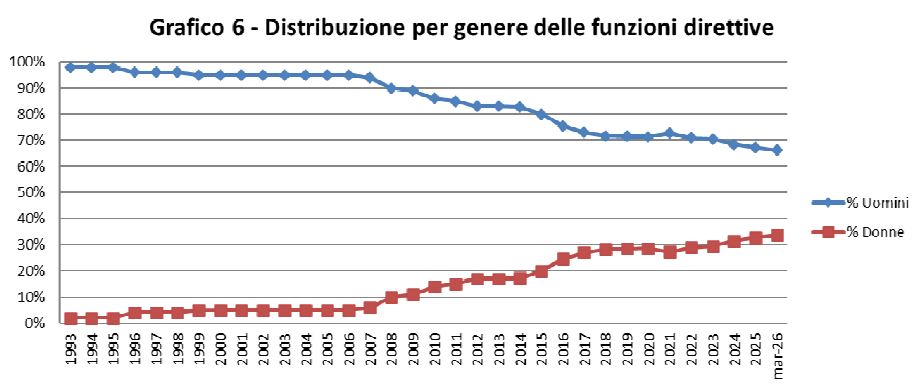 Per quanto riguarda i concorsi banditi, la percentuale di vincitrici supera stabilmente quella dei vincitori dal 1996, e raggiunge il picco con il concorso bandito con decreto ministeriale del 19 ottobre 2019: su 209 idonei, sono 145 le donne, pari al 69,3%. Nel 2024, la percentuale si attesta al 56%; nel 2025 al 59%.