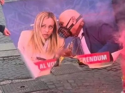 Una foto con la presidente del Consiglio Giorgia Meloni e il guardasigilli Carlo Nordio, rappresentato con una museruola, e su scritto ‘no al vostro Referendum’. È l’immagine che è stata bruciata durante il corteo organizzato a Roma per protestare contro la riforma.